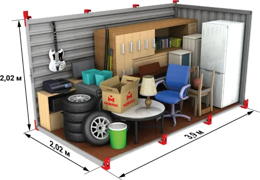 Клиентам предоставляются на выбор модули 4 типов, объемом от 5 до 16 м3 и полезной площадью от 2,53 до 7,88 м2. Высота достаточна для удобного размещения содержимого. Двери оборудованы взломостойким замком и могут дополнительно опечатываться в присутствии владельца.